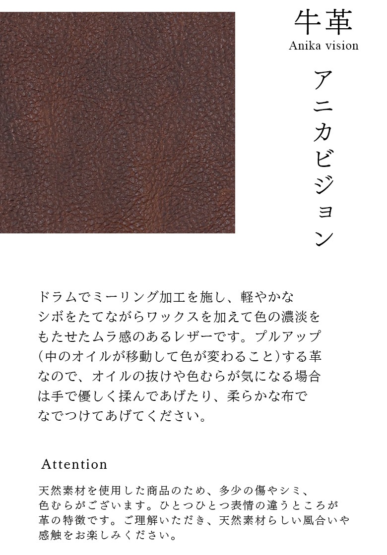 | 注意点 | ※Web表示の関係で、実物と色味が若干異なる場合がございます。 ※カラー・ロットにより細部のデザイン・色が多少異なる場合があります。 ※商品の仕様は、予告なく変更する場合がございます。 ※自然の風合いを大切にしている為、若干のキズ・ムラなどが入っている場合がございます。 特徴としてご了承下さいませ。 ※若干、革独特の匂いがある場合がございますが、使用している間に薄くなってまいりますのでご安心ください。 |